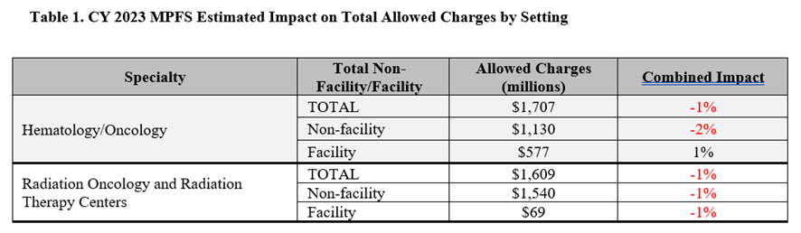 The Centers for Medicare & Medicaid Services (CMS) released its Medicare Physician Fee Schedule (MPFS) on July 7, 2022. Stakeholders have until September 6, 2022, to submit their comments to the agency on the proposed changes for calendar year (CY) 2023.  Below are several of the key items in the MPFS proposed rule that relate or impact oncology programs and providers. Note: some payment impacts are outside CMS’ authority to change.