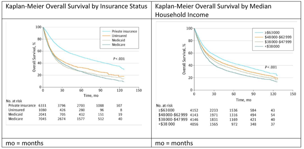 Not only are these dental care needs vital for patients with head and neck cancer, but studies reveal higher survival rates from head and neck cancer when care is provided by a dedicated team that meets regularly. However, the logistical challenges of assembling such teams can be daunting, and the lack of insurance coverage can exacerbate these difficulties. These factors have created a positive correlation between the level of insurance coverage and patient survival rates. The image below illustrates this relationship: