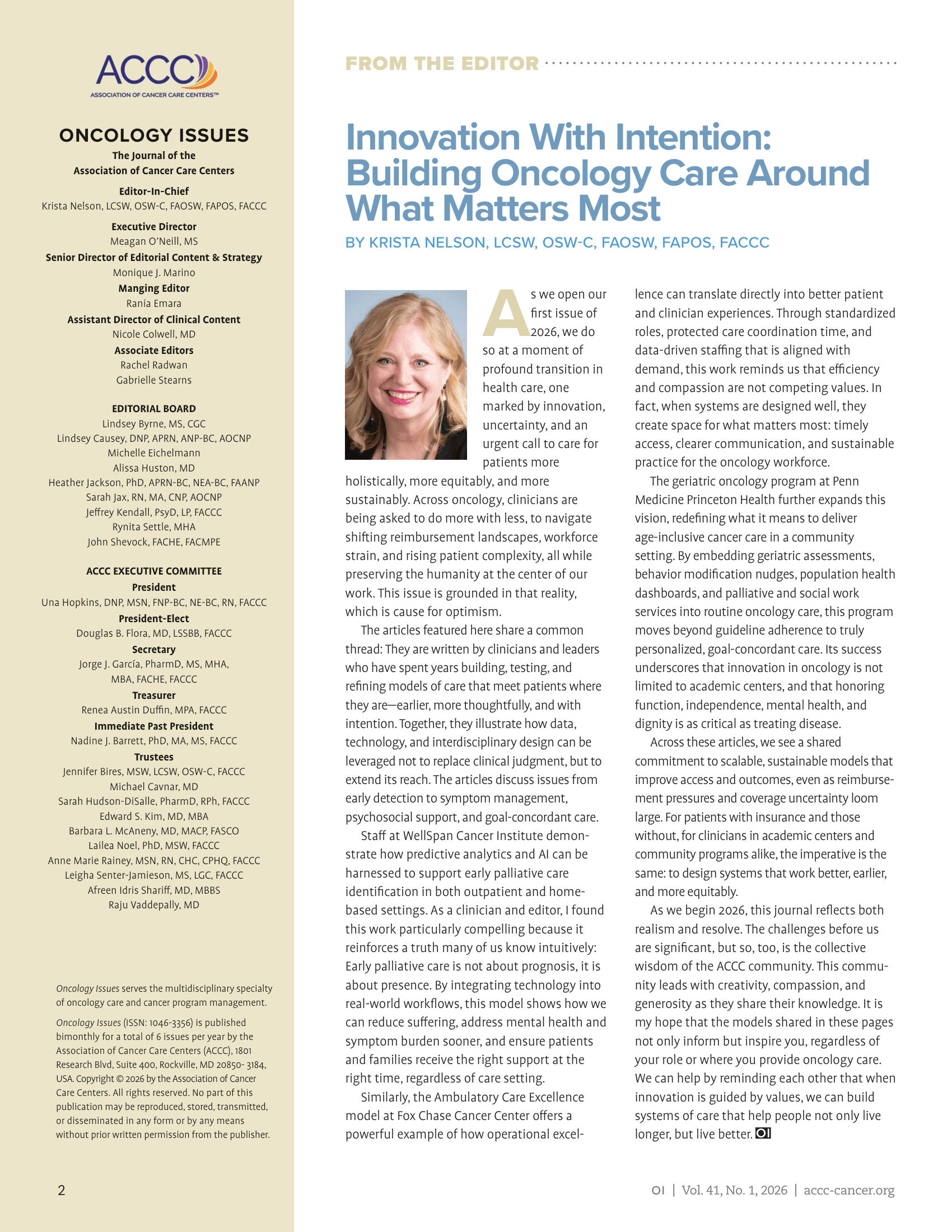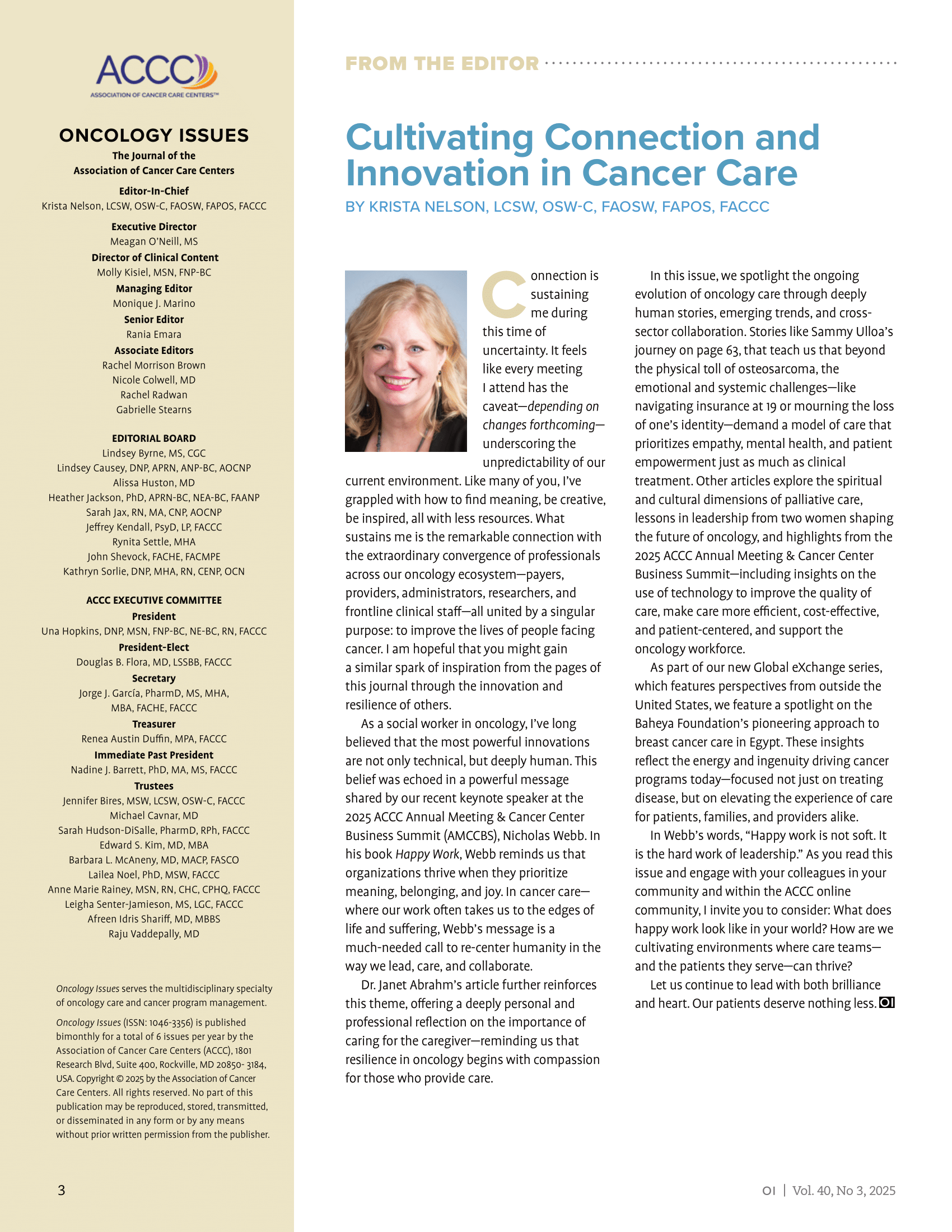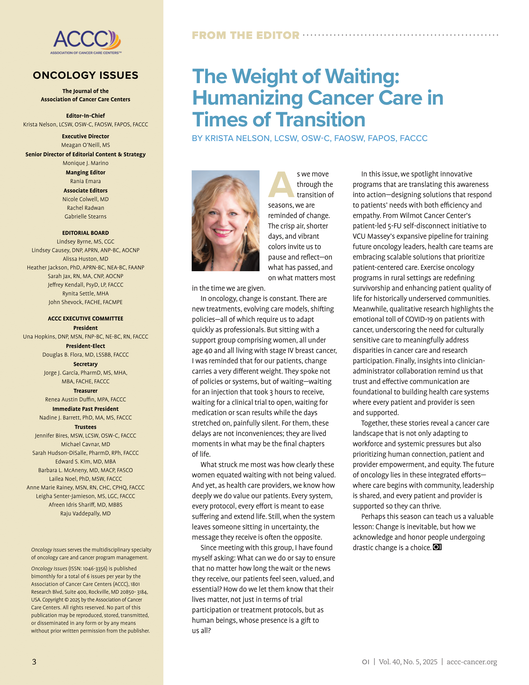 Krista Nelson, MSW, LCSW, OSW-C, FAOS, serves as manager of oncology social work and program manager for quality and research of Cancer Support Services at Providence Cancer Institute in Portland, Oregon. Over the years, she has specialized in many cancers and is interested in the effect of cancer on the family. Krista defines her role as providing support for people and their families throughout the cancer continuum, and sharing the expertise that she has learned from other patients with cancer. What she loves about working with those affected with cancer is being able to witness the grace, courage and life lessons of individuals dealing with cancer and the opportunity to be a part of their journey.