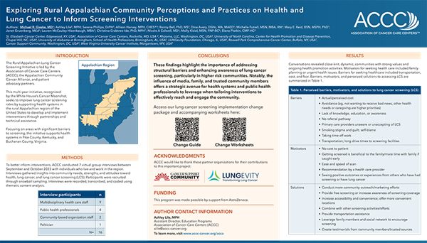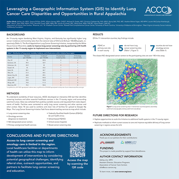 In response to the need for cancer screening and care in Appalachia, ACCC—together with several of its state chapters—launched the Appalachian Community Cancer Alliance (the Alliance) in December 2021. This project is a partnership with several state oncology societies representing the Appalachian region. The focus is on improving patient and operational cancer outcomes by identifying effective evidence-based practices that can be replicated throughout the region.