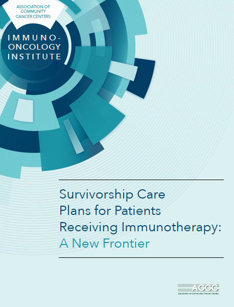 ACCC is pleased to offer a resource that explores the new frontier of Survivorship Care Plans for Patients Receiving Immunotherapy. The publication describes processes for developing survivorship care plans (SCPs) for patients treated with immunotherapy, effective practices in SCP design, and considerations for SCP delivery for this patient population.