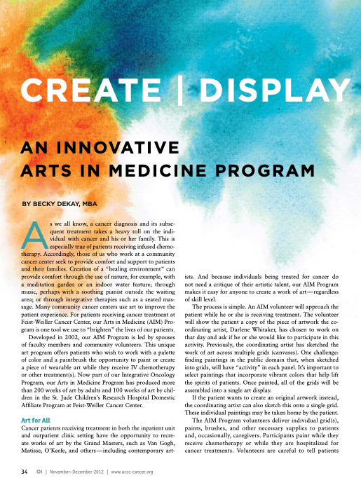 The Feist-Weiller Cancer Center developed the Arts in Medicine (AIM) program with the goal of improving the patient experience and to support a “healing environment” of care. Launched in 2002 and staffed by faculty spouses and volunteers, the program today is part of the cancer center’s Integrative Oncology Program. This unique art program offers patients the opportunity to work with a palette of color and a paintbrush while they receive IV chemotherapy or other treatment(s). Cancer patients receiving treatment in the inpatient or outpatient setting can participate—no prior experience is required.