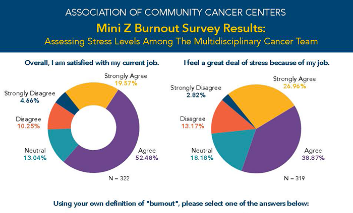To gauge the level of burnout in the multidisciplinary cancer care team, ACCC surveyed its membership in 2019 using the clinically validated Mini Z survey developed by the American Medical Association. While only a small number of respondents (14.9%) report dissatisfaction with their current job, burnout and stress levels are significant.