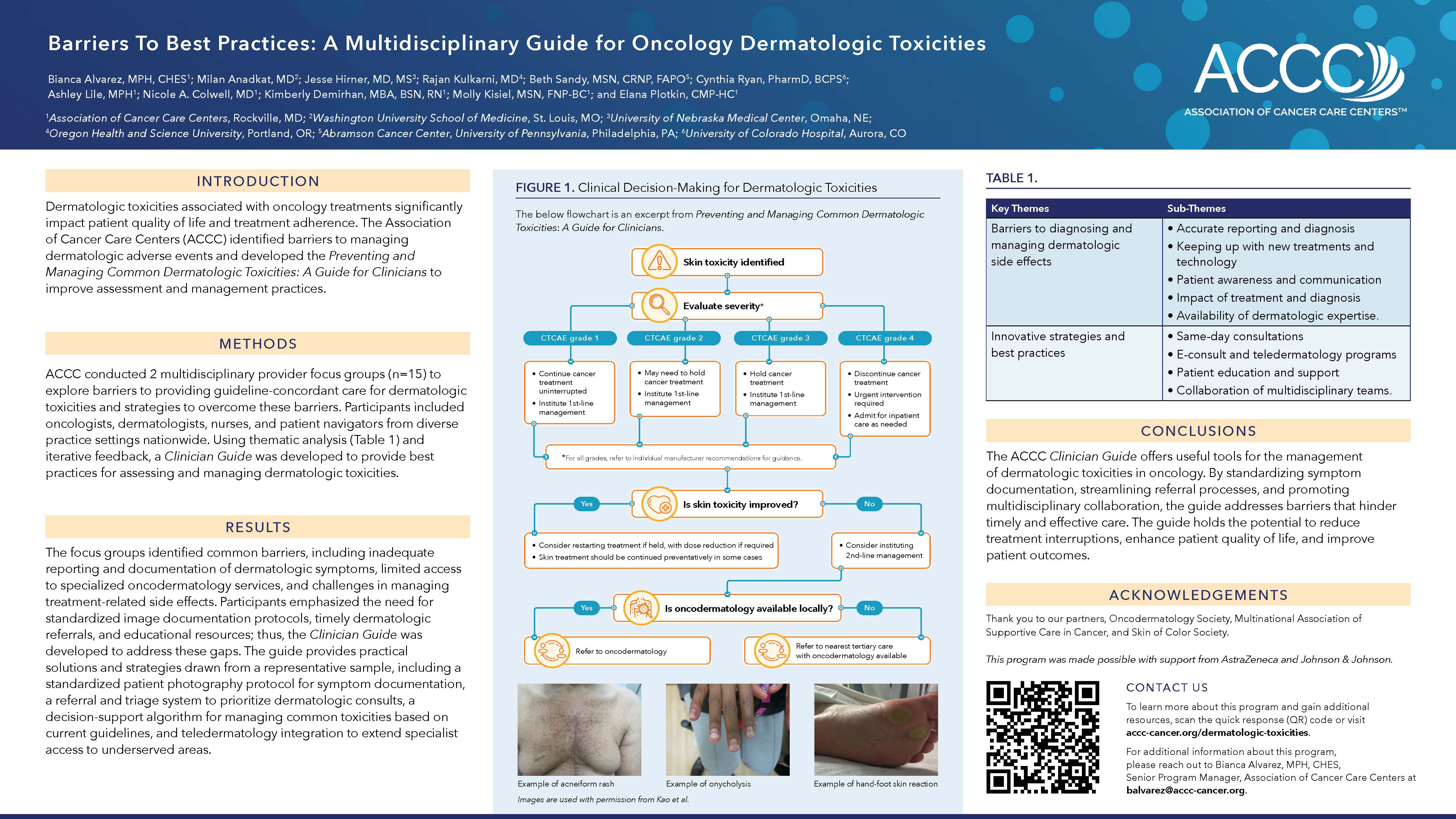 The Association of Cancer Care Centers (ACCC) provides resources to refine strategies for assessing, preventing, and managing dermatologic toxicities, emphasizing timely evaluation, clinical advancements, and overall care management to improve patient outcomes.