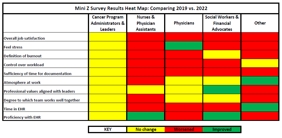 There was a lot of data to compare, and I tried to keep the analysis simple. To do so, I created a heat map to articulate the level of change or no change from 2019 to 2022. Yellow indicates that there was no change, red means there is increase in burnout, and green shows there was an improvement in burnout rates from 2019 to 2022 (see figure below).