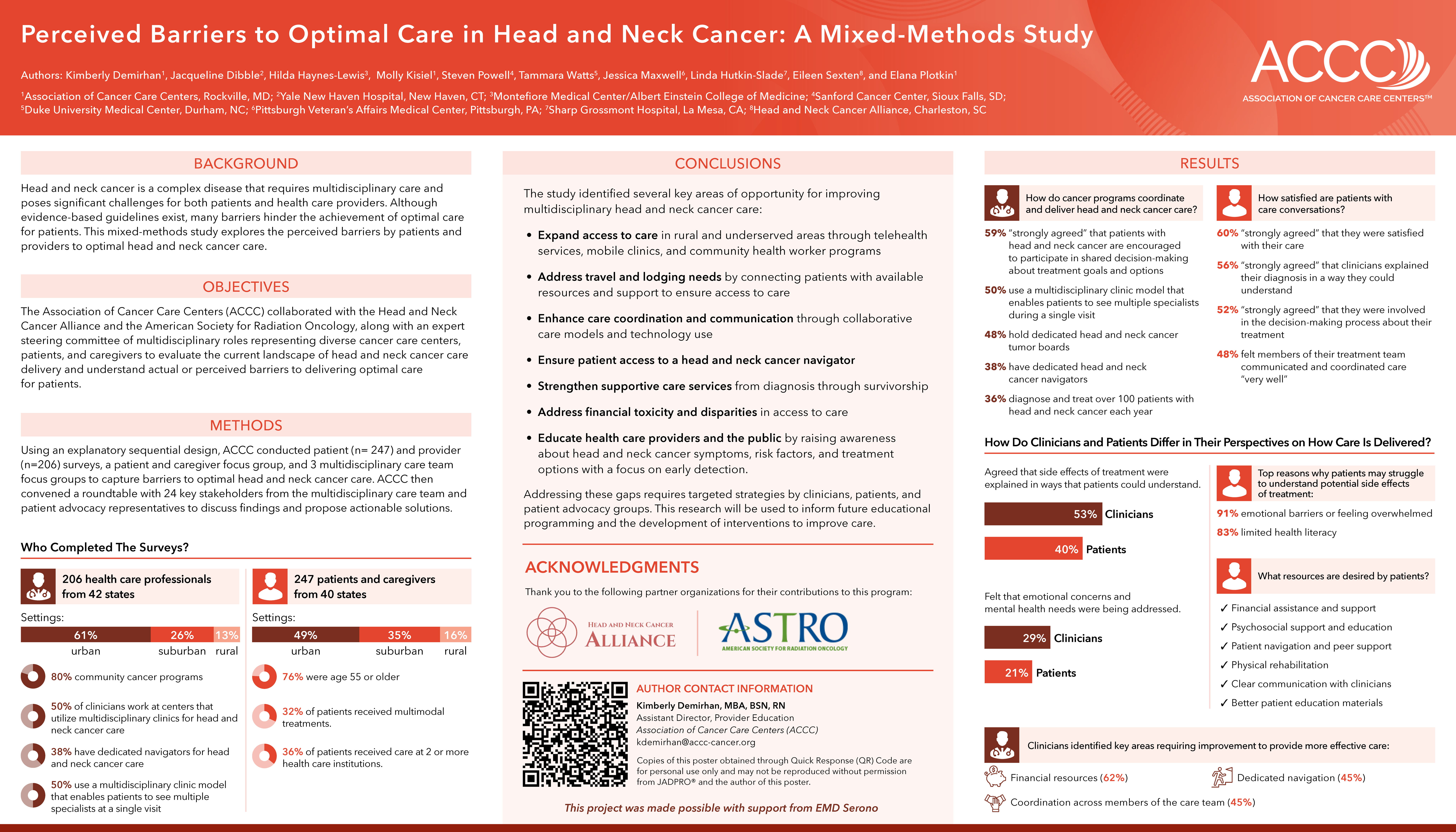 Head and neck cancer is a complex disease that requires multidisciplinary care and poses significant challenges for both patients and health care providers. Although evidence-based guidelines exist, many barriers hinder the achievement of optimal care for patients. This mixed-methods study explores the perceived barriers by patients and providers to optimal head and neck cancer care.