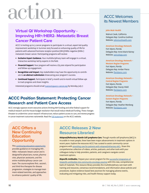 ACCC is inviting up to 3 cancer programs to participate in a virtual, expert-led quality improvement workshop in Summer 2025 focused on enhancing quality of life for patients with advanced hormone receptor-positive (HR+)/HER2-negative (HER2-) metastatic breast cancer. Participating programs will receive:
