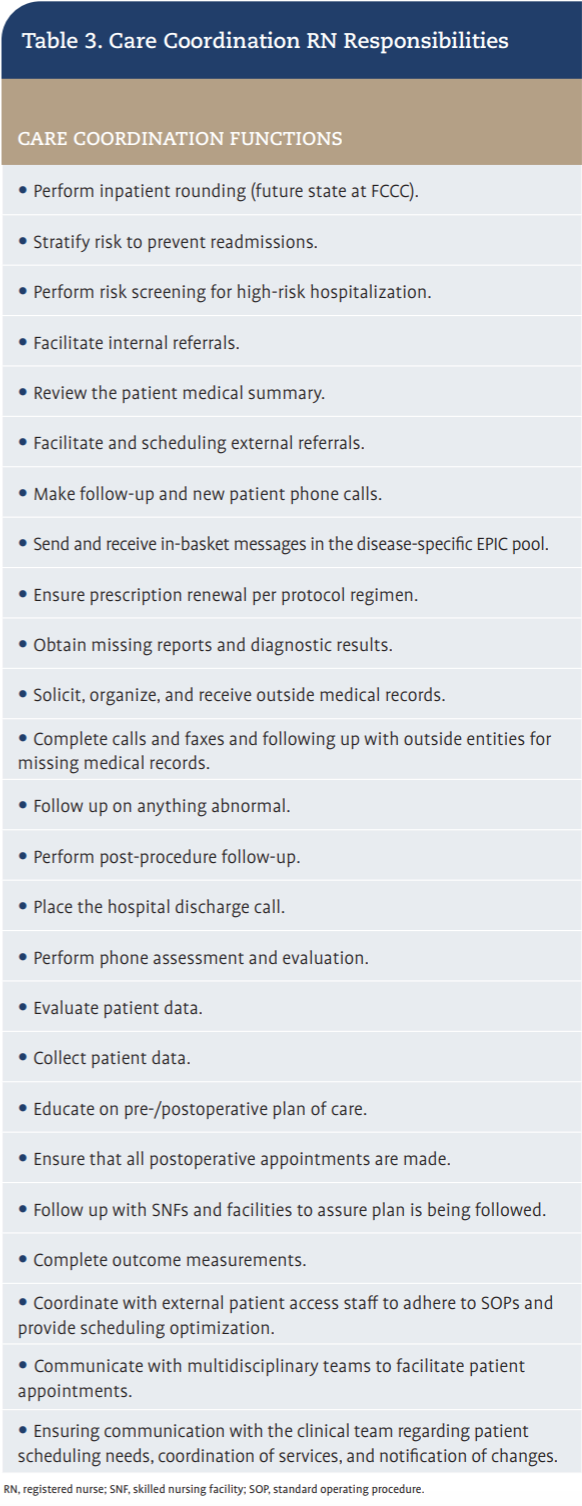 Care coordination responsibilities were integrated into the clinic RN role, supported by protected time allocations (≈ 0.2 FTE/RN or 1.0 FTE/disease team) to ensure consistent follow-up, external communication, and clinic preparation coverage. Key performance metrics for success were identified, and compliance with the redesigned workflows was monitored through monthly data collection and performance review cycles.