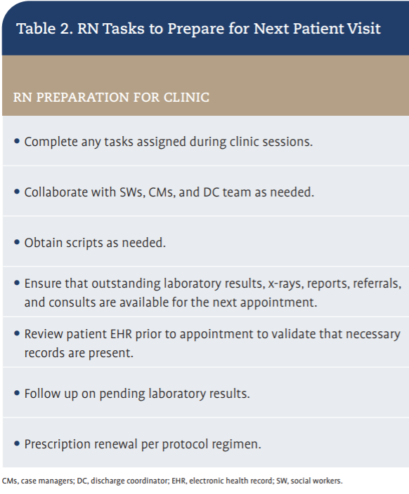 Nurses play a critical role in ensuring continuity and quality of care through timely coordination of diagnostic and supportive services and multidisciplinary collaboration. Benchmarking and workload modeling identified the need for protected nurse care coordination time hardwired into schedules to create predictable capacity for validation before visits, results management, and coordination between visits. Table 2 lists the standard RN tasks to prepare for the next patient visit. Care coordination tasks embedded in the clinic RN workload are listed in Table 3.