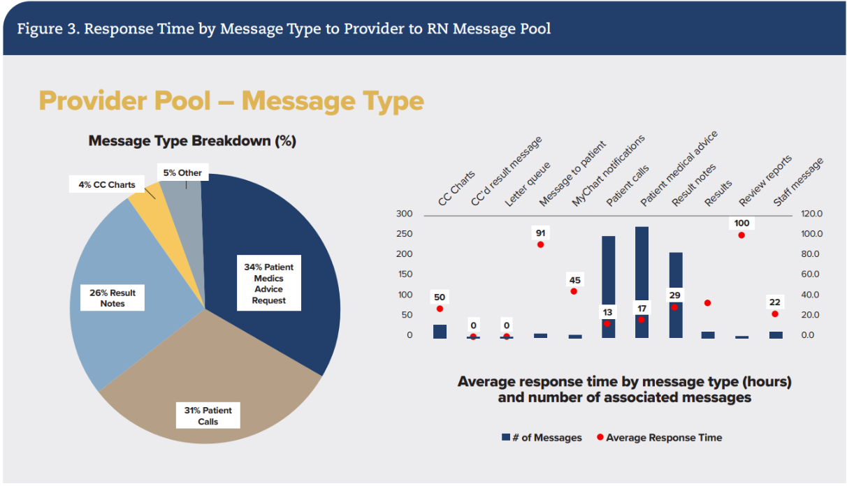 Compliance with the standardized communication process was assessed through analysis of provider message volumes directed to service line–specific nursing pools (Figure 3). Clinic nurse efficiency in managing patient portal messages was reviewed monthly, focusing on responsiveness, message volume, and usage trends. Role-based message analysis revealed that physicians generated the majority of nursing pool messages. Across 807 physician-initiated communications, the average response time was 30.4 hours, confirming that all routine messages were addressed within the 2-day target. Message volumes and response patterns were tracked longitudinally to inform workload balancing and improve communication flow.