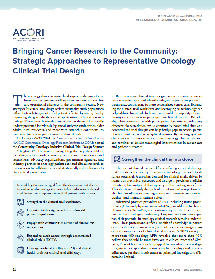 On October 29-30, 2024, the Association of Cancer Care Centers (ACCC) Community Oncology Research Institute (ACORI) hosted the Community Oncology Inclusive Clinical Trial Design Summit in Arlington, VA. The summit brought together key stakeholders, including academic and community cancer center practitioners and researchers, advocacy organizations, government agencies, and industry partners in oncology patient care and clinical research to discuss ways to collaboratively and strategically reduce barriers to clinical trial participation.