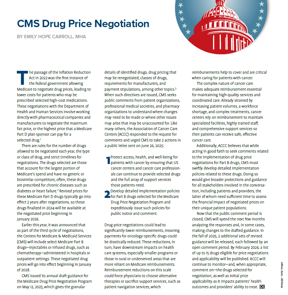 Now that the public comment period is closed, CMS will spend the next few months analyzing the responses and, in some cases, making changes to the drafted guidance. In the fall of 2025, 2 additional sets of revised guidance will be released, each followed by an open comment period. By February 2026, a list of up to 15 drugs eligible for price negotiations and applicability will be published. ACCC will continue to monitor—and, when appropriate, comment on—the drugs selected for negotiation, as well as initial price applicability as it impacts patients’ health outcomes and providers’ ability to treat.