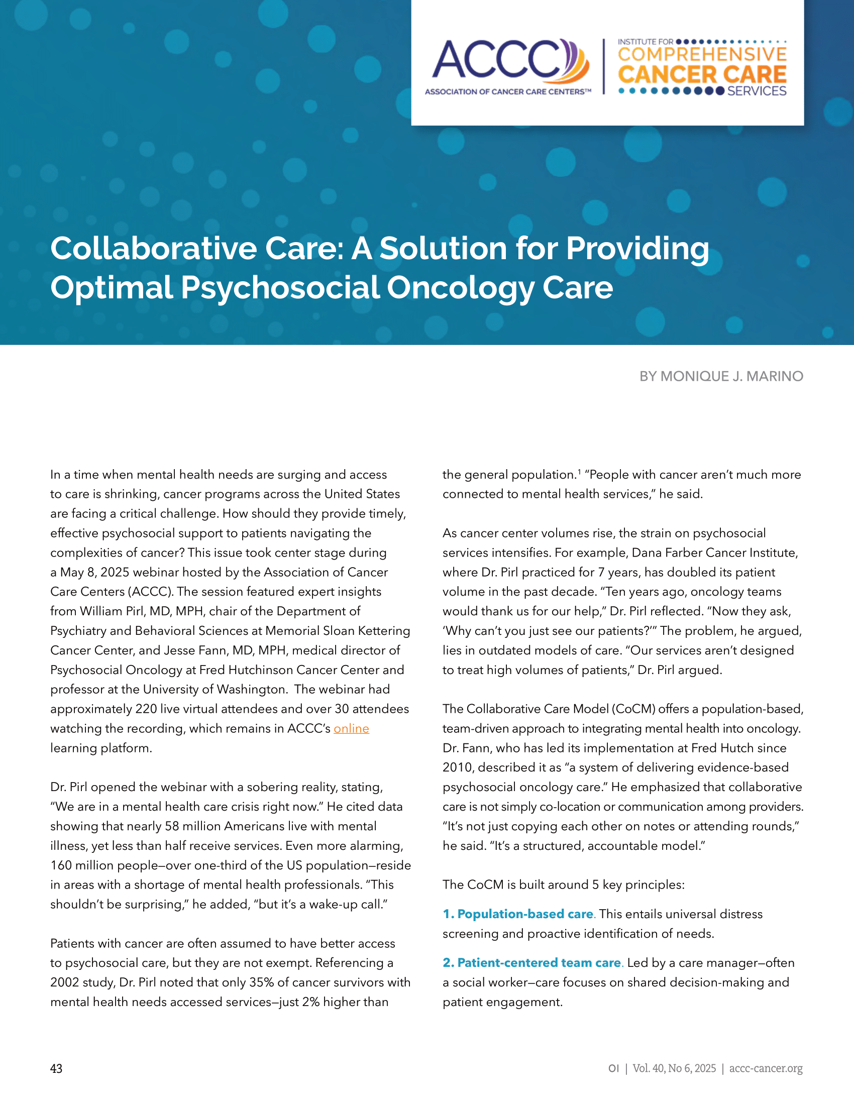 The second installment of ACCC’s Collaborative Care webinar series was held July 24, 2025, and highlighted actionable strategies for implementing the CoCM in cancer centers. Moderated by Past ACCC President Krista Nelson, MSW, LCSW, OSW-C, the webinar featured insights from Dr. Pirl; Dr. Fann; and Ailey Armstrong, MSW, LICSW, an oncology clinical social worker who partners with Dr. Fann at the Fred Hutchinson Cancer Center (Fred Hutch) in Seattle, Washington. These experienced cancer care professionals provided a comprehensive roadmap for integrating population-based psychosocial care into oncology workflows. Over 235 cancer care professionals registered for the event, with approximately 120 attendees actively participating in the live sessions. Participants gained insights into up-front preparation, stakeholder engagement, role definition, workflow development, and strategies for financial sustainability.