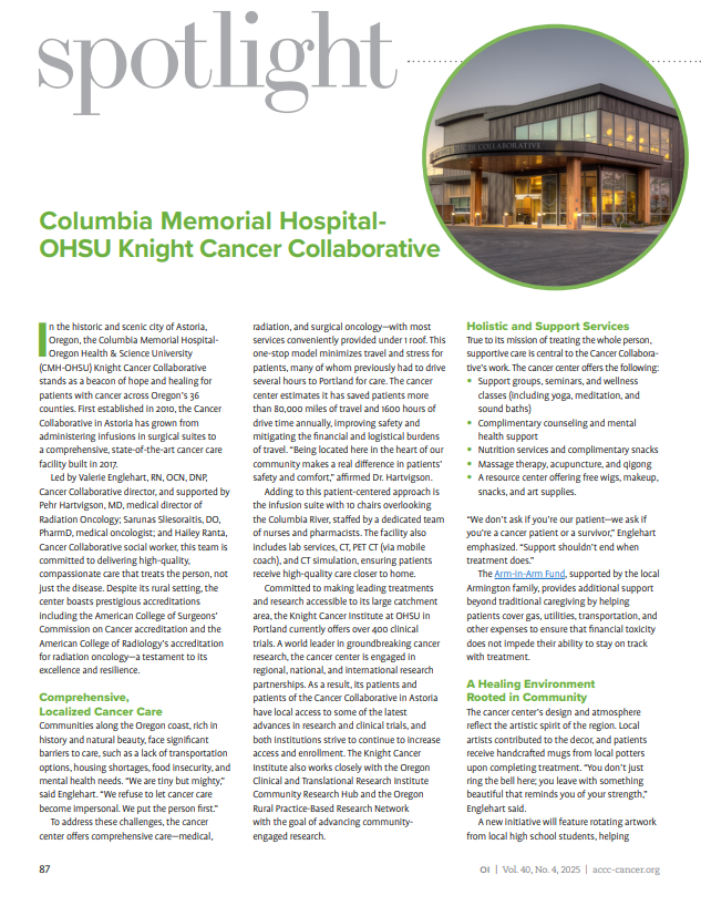 The CMH-OHSU Knight Cancer Collaborative is more than a treatment center: it’s a model of what compassionate, community-rooted, and innovative rural cancer care can look like. By blending high-quality clinical services with holistic support and a deep respect for the people they serve, the team has created a space where healing is not only possible but personal. As the Cancer Collaborative continues to grow and adapt, its commitment to equity, dignity, and community-driven innovation sets a powerful example for rural cancer health care systems nationwide.