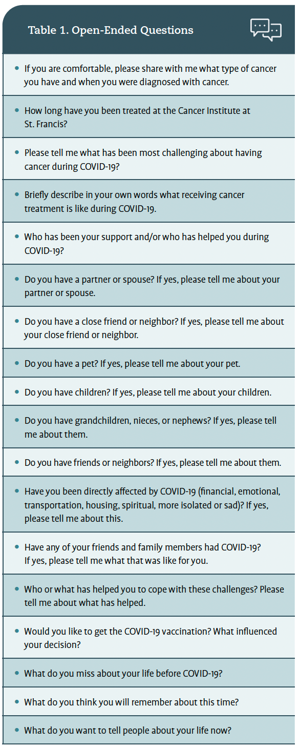 After completing the Well-being Assessment Tool, patients were asked open-ended questions regarding their diagnosis, cancer treatment regimen, relationship with their health care team, experiences during the COVID-19 pandemic, coping with social isolation, and their hopes for a post-COVID-19 world. Open-ended questions are key in qualitative research, especially exploratory studies. These questions allow participants to express their thoughts and feelings in their own words, offering researchers a deeper understanding of complex phenomena.20