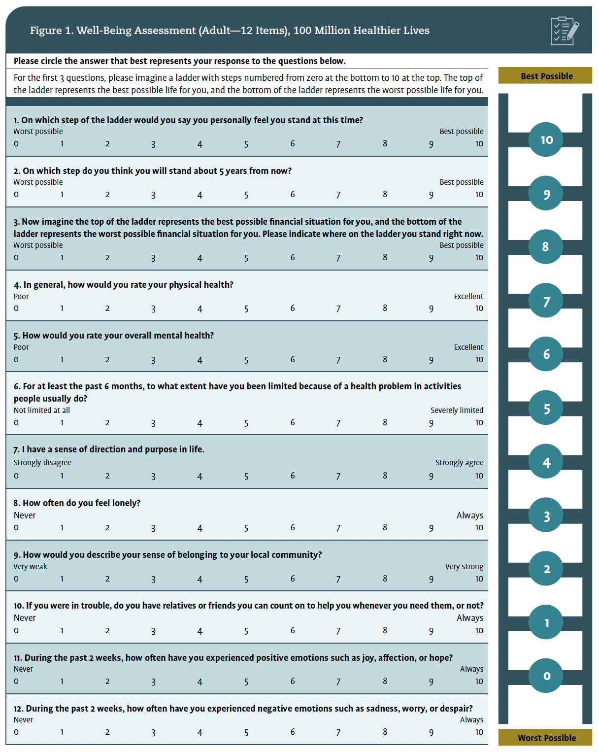 The Well-Being Assessment Tool is a well-established, validated tool developed âas part of the 100 Million Healthier Lives initiativeâŚ[to] help individuals, organizations, and communities measure what matters most to advance health, well-being, and equity at multiple levels and across topics.â18 Each item of the survey questions was validated separately. Subsequently, the entire tool was validated through a comprehensive project involving a diverse, multicity sample of the US population.19