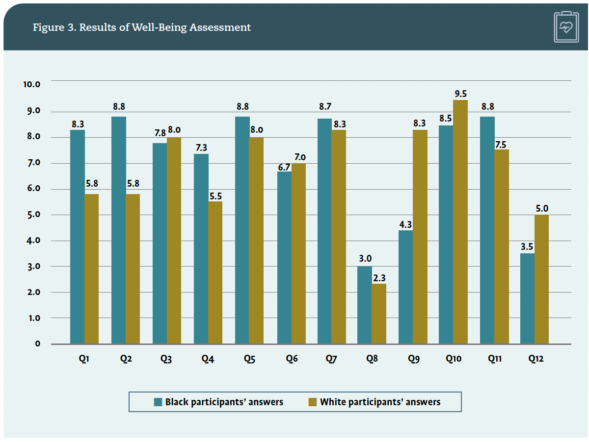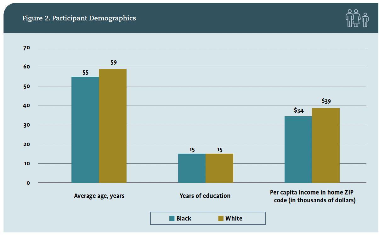 The study consisted of 4 African American and 4 White patients. Participantsâ ages ranged from 45 to 68, with a median age of 55. The sample included 5 women (63%) and 3 men (37%), specifically 3 African American women, 1 African American man, 3 White men, and 1 White woman, ensuring a mix of gender and racial representation. Education level, determined by the Well-being Assessment Tool, was converted into years for comparison, and ZIP codes were used to assess the average per capita income of the participantsâ home areas.17 Half the participants were unmarried (n = 4; 50%). No significant differences in age, years of education, or per capita income between White and African American participants were found. Participant demographics are listed in Figure 2. Well-being assessment questions were compiled, averaged, and compared across groups of participants, as presented in Figure 3.