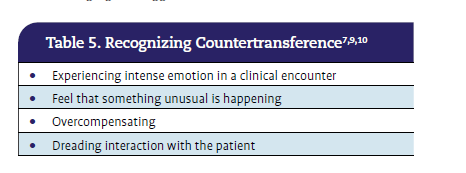 How can oncologists recognize when countertransference is at play (Table 5)? Bapat and Bojarski state: “Whenever a clinician experiences intense emotion during a clinical encounter, be it pleasant or unpleasant, this may signify the presence of transference and/or countertransference.”10 Rosenberg et al recommend: “We can offer ourselves ‘internal supervision’ and take a few moments for introspection of our emotional state when something feels unusual or intense in a clinical situation. [We can ask] am I doing things to overcompensate my reluctance to see her, such as exceeding the usual appointment time?”7 Ask yourself what seemed unusual or surprising, and talk with a colleague about what happened. It is normal to have a variety of responses to patients, but try to explore what in yourself may have been triggered by this patient.9 Acknowledging the triggers can defuse them.