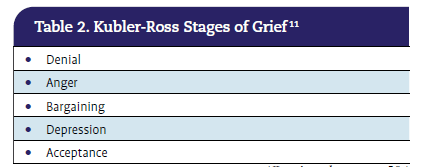 We know the classic Kubler-Ross stages of grief that our patients and families will manifest: denial (“It’s someone else’s CT scan!”); anger (spouses or partners attacking you for “not caring” when you delivered bad news); bargaining (“I’ll do anything if you enroll me in the next trial”), depression; and (in some cases) acceptance (Table 2).11