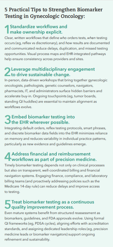 Embedding precision medicine into gynecologic oncology requires more than just access to biomarker testing; it demands operational systems that ensure every eligible patient receives timely, guideline-concordant care. Across 3 geographically and structurally diverse cancer programs, this nationwide QI initiative demonstrates that data-driven, multidisciplinary collaboration can uncover barriers that might otherwise remain invisible within routine workflows.