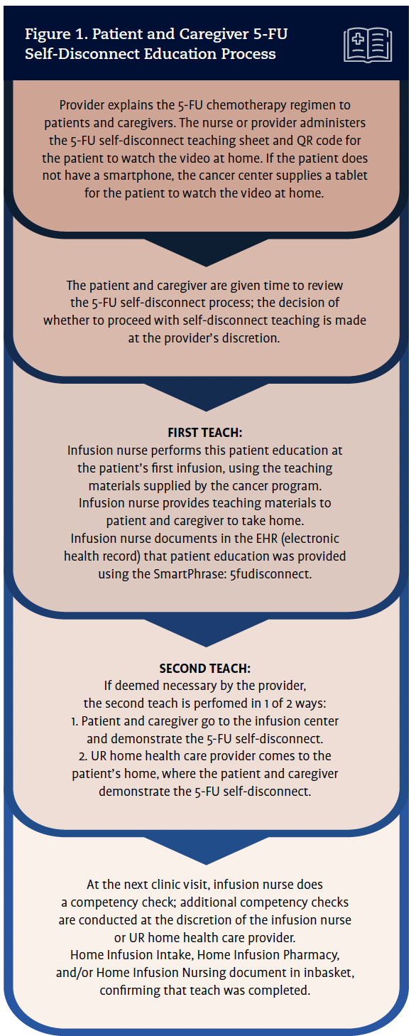 Our team created a teaching sheet, including visual instructions and a QR code for the patient to watch a video. Prior to the patient’s first self-disconnect teaching session, a referral to a certified home care agency is made. If both provider and patient feel confident and comfortable with the process after the teaching session, the home care referral is canceled. Otherwise, the referral will remain in place. Patients are given resource sheets to troubleshoot the most common issues, including if the IV pump is not functioning appropriately, and other helpful information to facilitate successful 5-FU self-disconnects. Patients receive phone numbers for UR Home Infusion and for the Eclipse hotline to help answer questions related to the eclipse bulb (the balloon-shaped device that delivers IV medication). Patients also receive a yellow chemotherapy bucket with a preprinted mailing label and instructions; when filled, patients return the bucket by mail. Figure 1 illustrates our 5-FU self-disconnect education process.