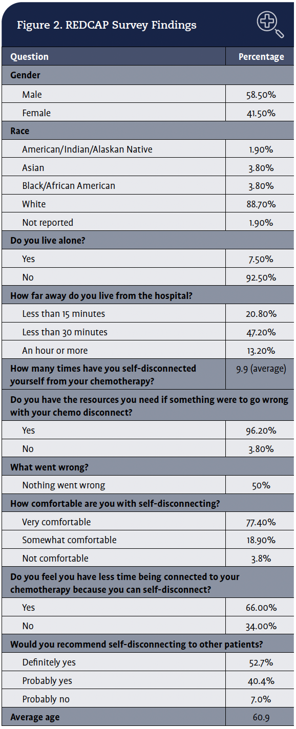 Of these 358 patients, 136 received education and were deemed suitable to safely self-disconnect from home. Based on REDCAP survey data, these patients performed this task without any issues. Specifically, 122 surveys were sent to patients, and a total of 55 responses were returned—a 45% response rate. Patient demographics and survey responses are shown in Figure 2. Patient feedback indicated that 5-FU self-disconnects in the home is feasible and allows patients to take part in their care safely. Open-ended comments included:
