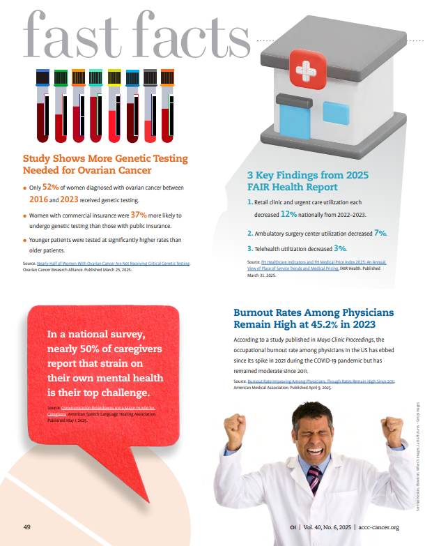 Source. Nearly Half of Women With Ovarian Cancer Are Not Receiving Critical Genetic Testing. Ovarian Cancer Research Alliance. Published March 25, 2025.