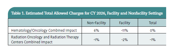 For oncology, specifically hematology/ oncology, this area is where the greatest impacts are estimated. As mentioned earlier, time-based services are the predominant services billed by hematology/oncology as opposed to radiation oncology. The proposed decreases in services in the facility setting will negatively impact E/M visits. CMS estimates a decrease of 5% to 10% to the overall reimbursement for E/M visits. When combined with any other services billed by hematology oncologists, this proposed change results in an estimated 11% decrease in reimbursement for CY 2026. The magnitude of the impact on hematology/oncology will depend on the practice patterns and specialty of any given physician; it does not mean every hematology oncologist will see the same reductions.
