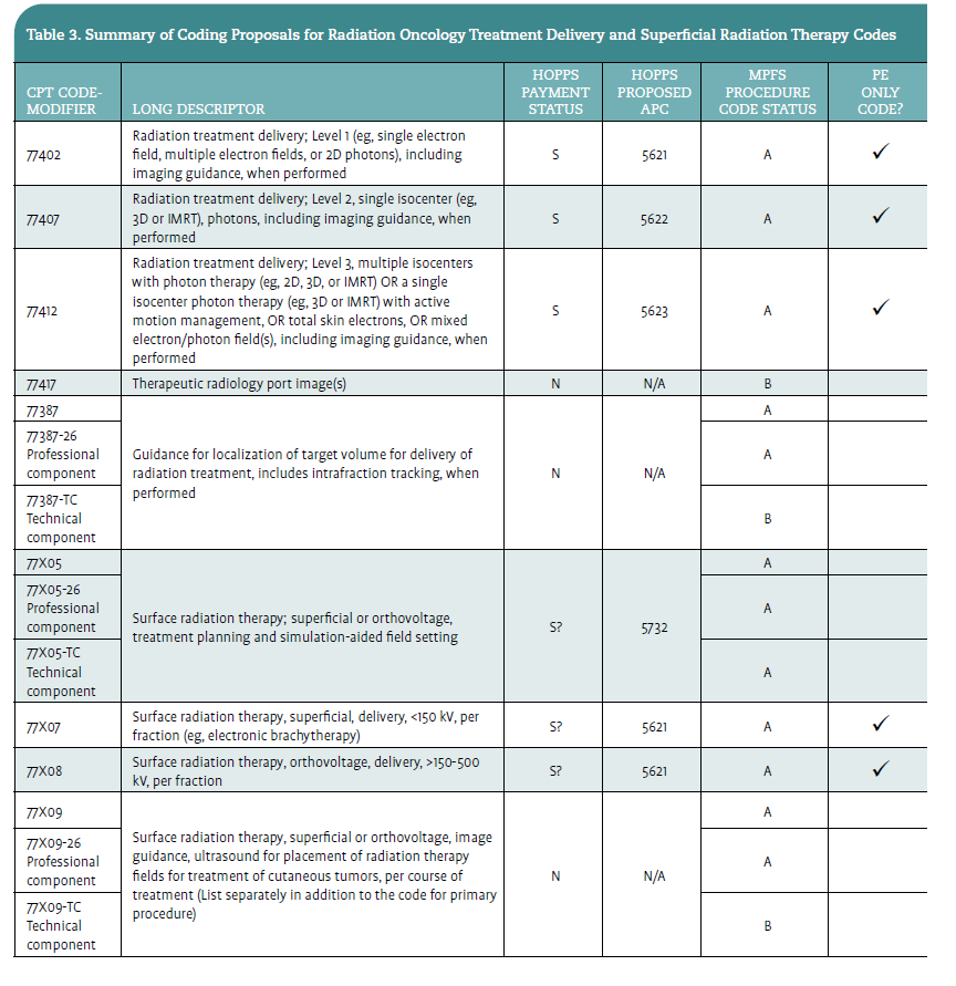 CMS provided Table 3 to assist in better understanding the code and payment status regarding the updates for CY 2026 for both external beam radiation and superficial radiation therapy.