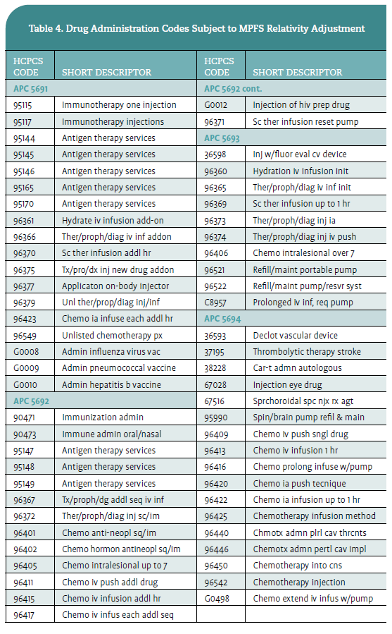 For CY 2026, CMS proposed to apply the MPFS relativity adjustment to drug administration codes within APCs 5691, 5692, 5693, and 5694 as they currently do for clinic visits (G0463). Meaning, the excepted provider-based departments would no longer be paid at the full HOPPS rate; instead, they would be paid at 40% of the rate, a reduction of 60%. CMS believes this change would align reimbursement to that in the office-based setting and be paid under the MPFS. Table 4 includes all drug administration codes within the selected APCs proposed by CMS to be paid at 40% of the HOPPS rate.