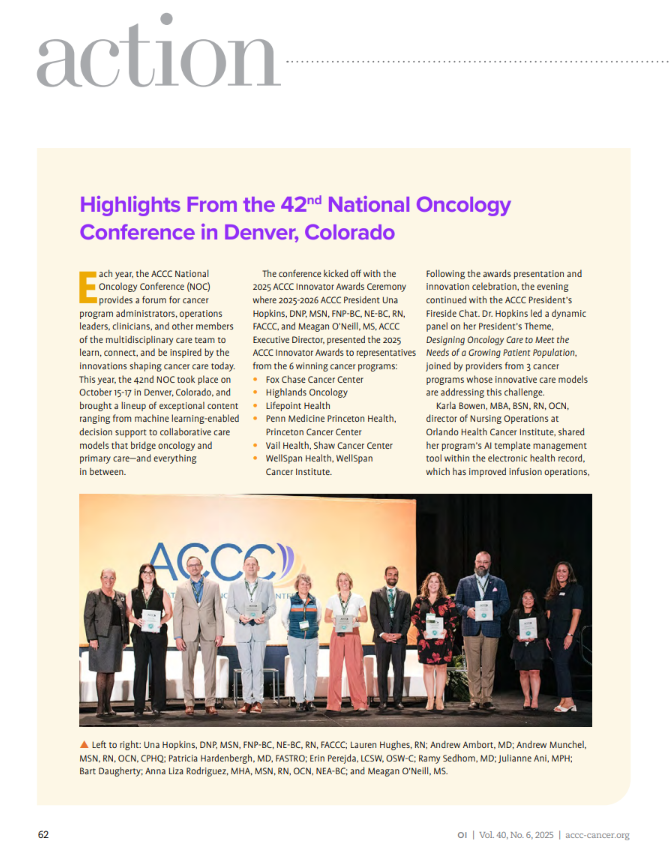 Each year, the ACCC National Oncology Conference (NOC) provides a forum for cancer program administrators, operations leaders, clinicians, and other members of the multidisciplinary care team to learn, connect, and be inspired by the innovations shaping cancer care today. This year, the 42nd NOC took place on October 15-17 in Denver, Colorado, and brought a lineup of exceptional content ranging from machine learning-enabled decision support to collaborative care models that bridge oncology and primary care—and everything in between.