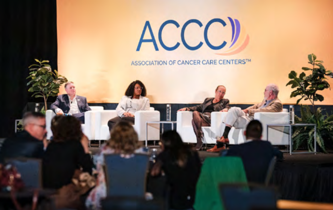 Following the awards presentation and innovation celebration, the evening continued with the ACCC President’s Fireside Chat. Dr. Hopkins led a dynamic panel on her President’s Theme, Designing Oncology Care to Meet the Needs of a Growing Patient Population, joined by providers from 3 cancer programs whose innovative care models are addressing this challenge.