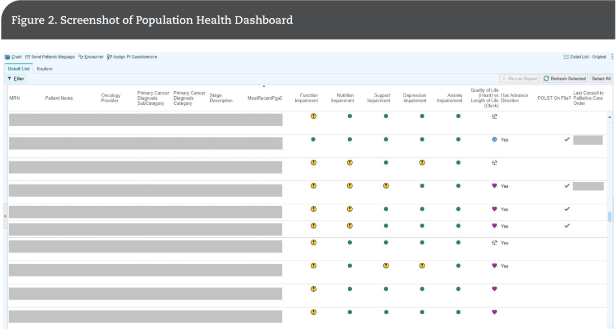 - A novel population health dashboard that enables real-time monitoring of geriatric assessment completion rates, hospitalizations, and advance care planning discussions. The dashboard functions as a quality improvement tool and a clinical decision support system, ensuring that high-risk patients receive targeted interventions in a timely manner (Figure 2).
