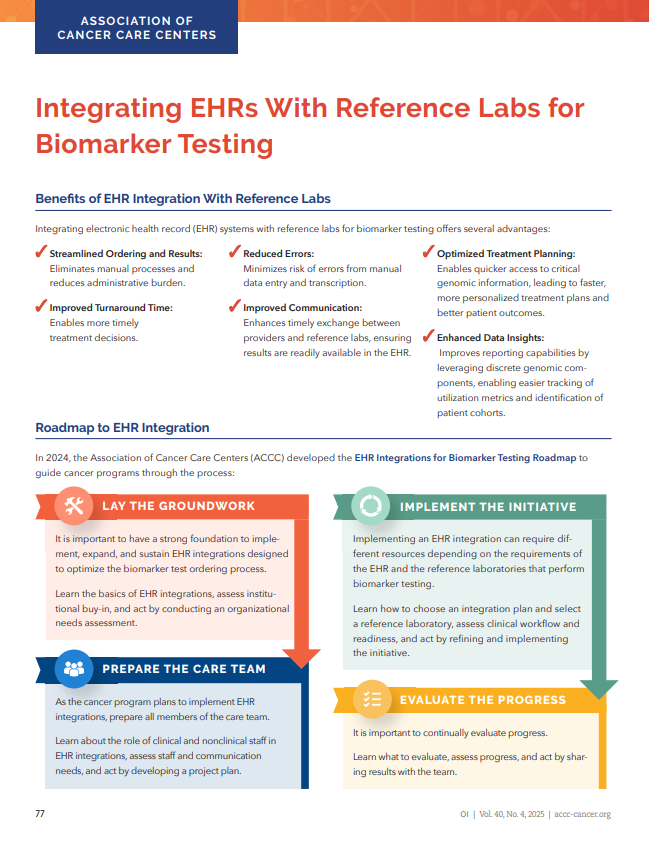 In 2024, the Association of Cancer Care Centers (ACCC) developed the EHR Integrations for Biomarker Testing Roadmap to guide cancer programs through the process: