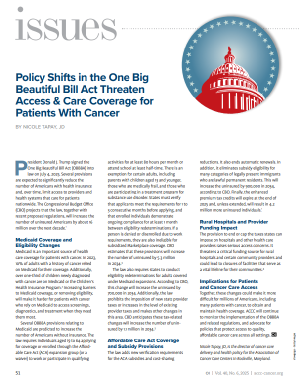 Together, these changes could make it more difficult for millions of Americans, including many patients with cancer, to obtain and maintain health coverage. ACCC will continue to monitor the implementation of the OBBBA and related regulations, and advocate for policies that protect access to quality, affordable cancer care across all settings.