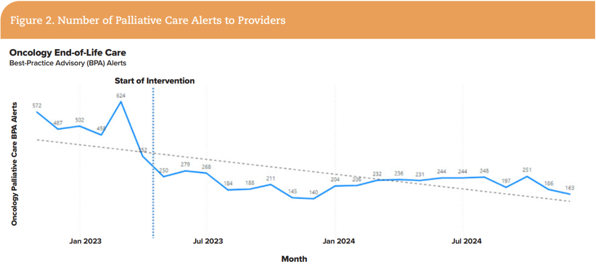 Equally important, the tool preserved physician autonomy. The alert did not prescribe a specific action; it simply brought forward information at the moment it was most relevant. This design supported reflection, without replacing provider judgment. This balance between data and empathy proved essential for sustained adoption. The clinical decision support prompt became not a compliance measure but a cue for awareness, a data-informed reminder to ensure that important conversations and co-management with a palliative care provider happened earlier in the patient's journey.