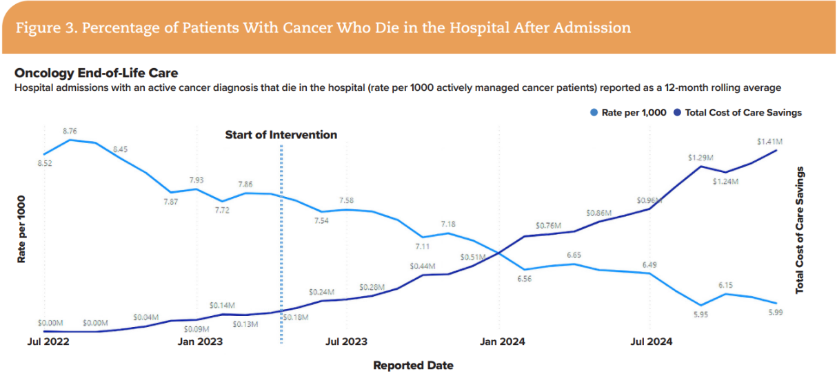These goals aligned directly with WellSpan's systemwide quality and value-based care priorities. Rather than viewing palliative care as a downstream service, the team reframed it as a proactive component of comprehensive oncology care, one that improves both patient experience and cost sustainability. This alignment not only advanced the organization's quality metrics but also reinforced its commitment to value-based oncology care, where improving outcomes and lowering cost are viewed as complementary goals rather than competing ones.