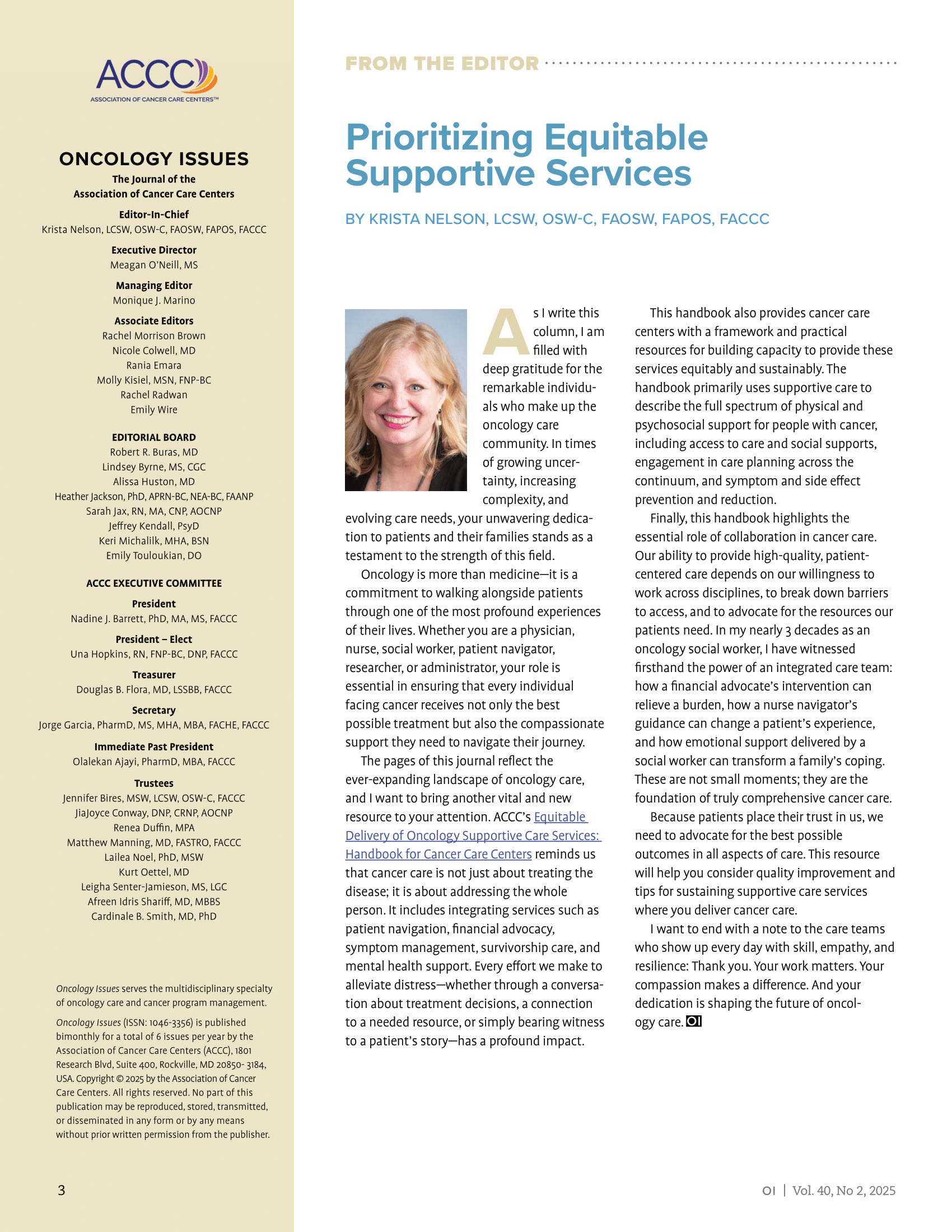 The pages of this journal reflect the ever-expanding landscape of oncology care, and I want to bring another vital and new resource to your attention. ACCC’s Equitable Delivery of Oncology Supportive Care Services: Handbook for Cancer Care Centers reminds us that cancer care is not just about treating the disease; it is about addressing the whole person. It includes integrating services such as patient navigation, financial advocacy, symptom management, survivorship care, and mental health support. Every effort we make to alleviate distress—whether through a conversation about treatment decisions, a connection to a needed resource, or simply bearing witness to a patient’s story—has a profound impact.