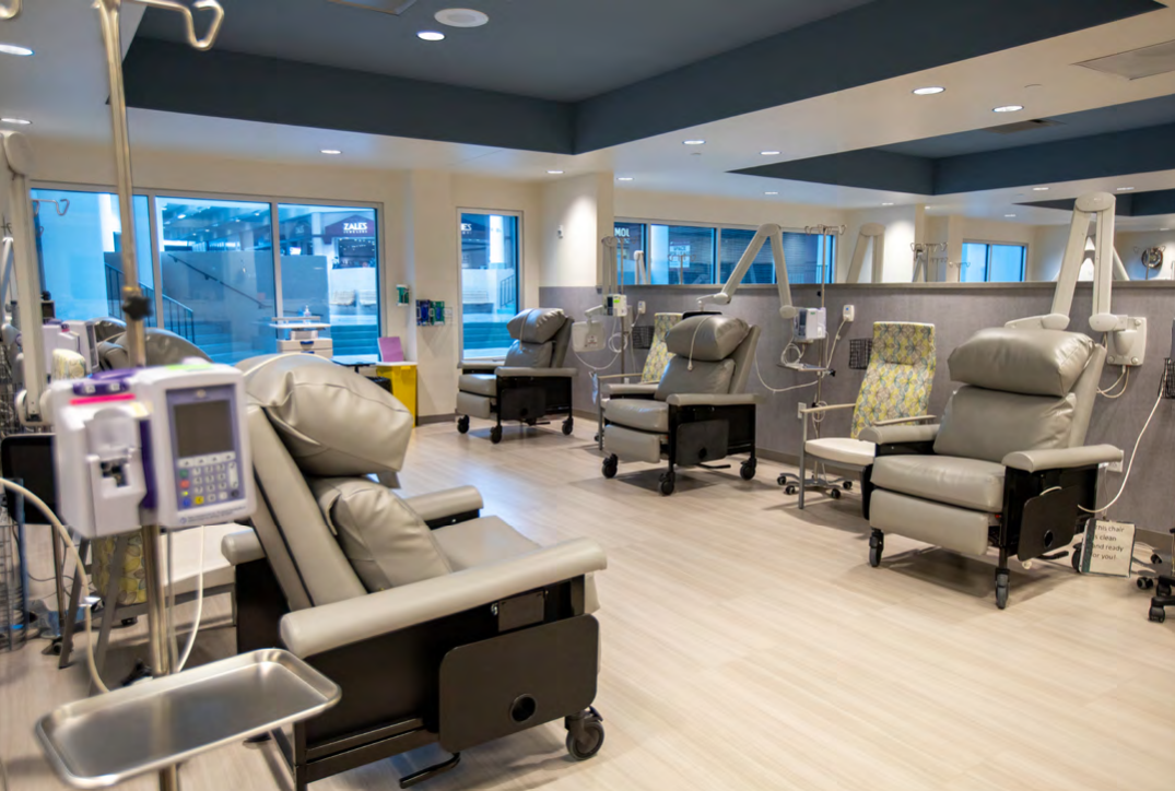 QMG Cancer Institute’s infusion room, with one-way windows overlooking the Quincy Town Center fountain court.