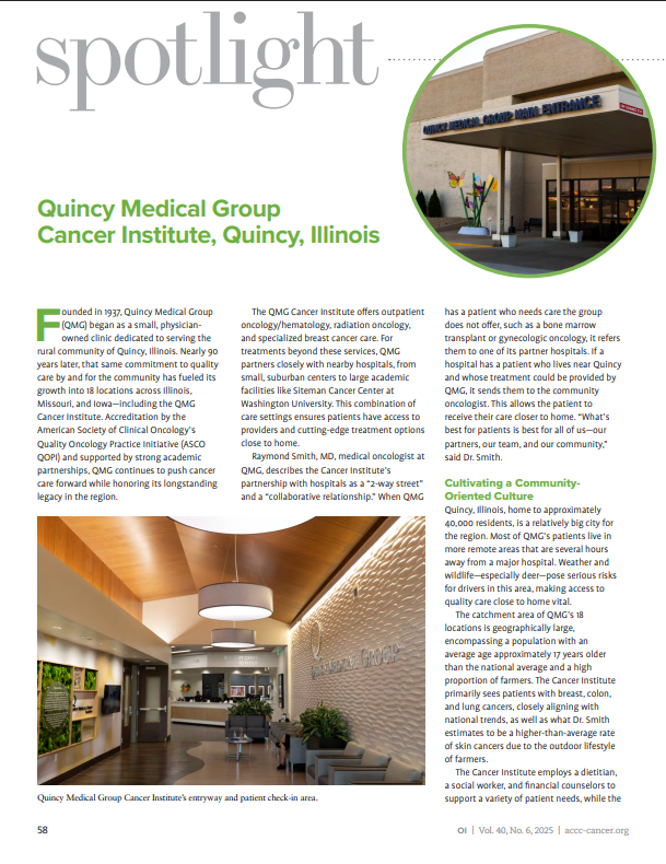 Founded in 1937, Quincy Medical Group (QMG) began as a small, physician owned clinic dedicated to serving the rural community of Quincy, Illinois. Nearly 90 years later, that same commitment to quality care by and for the community has fueled its growth into 18 locations across Illinois, Missouri, and Iowa—including the QMG Cancer Institute. Accreditation by the American Society of Clinical Oncology’s Quality Oncology Practice Initiative (ASCO QOPI) and supported by strong academic partnerships, QMG continues to push cancer care forward while honoring its longstanding legacy in the region.