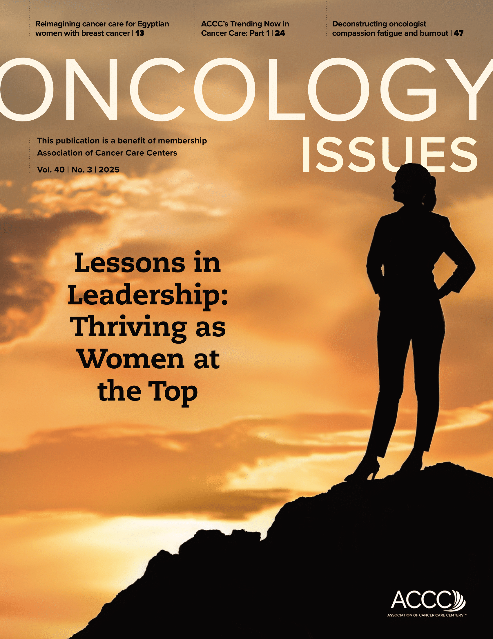 Nadine J. Barrett, PhD, MA, MS, FACCC, is immediate past president of ACCC and senior associate dean, Community Engagement and Equity in Research at Atrium Health Wake Forest Comprehensive Cancer Center in Durham, North Carolina. Kimberly Johnson, MD, MHS, is Brenda A. Armstrong MD Distinguished Professor of Medicine in the Division of Geriatrics and Palliative Care at Duke Medicine in Durham, North Carolina. Ramona Rhodes, MD, is associate professor at the University of Texas Southwestern Medical Center in Dallas, Texas. Declan Walsh, MD, is chair of the Department of Supportive Oncology at Atrium Health Levine Cancer Institute in Charlotte, North Carolina.