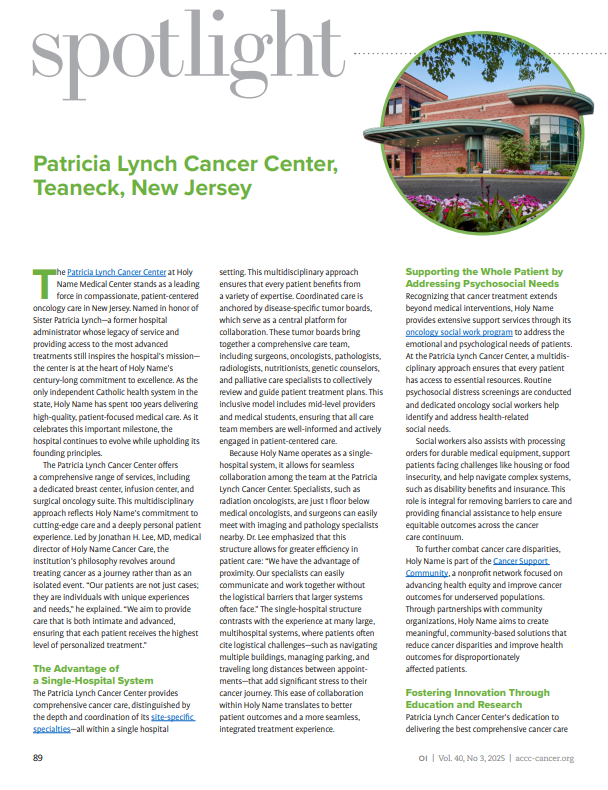 Because Holy Name operates as a single-hospital system, it allows for seamless collaboration among the team at the Patricia Lynch Cancer Center. Specialists, such as radiation oncologists, are just 1 floor below medical oncologists, and surgeons can easily meet with imaging and pathology specialists nearby. Dr. Lee emphasized that this structure allows for greater efficiency in patient care: “We have the advantage of proximity. Our specialists can easily communicate and work together without the logistical barriers that larger systems often face.” The single-hospital structure contrasts with the experience at many large, multihospital systems, where patients often cite logistical challenges—such as navigating multiple buildings, managing parking, and traveling long distances between appointments—that add significant stress to their cancer journey. This ease of collaboration within Holy Name translates to better patient outcomes and a more seamless, integrated treatment experience.