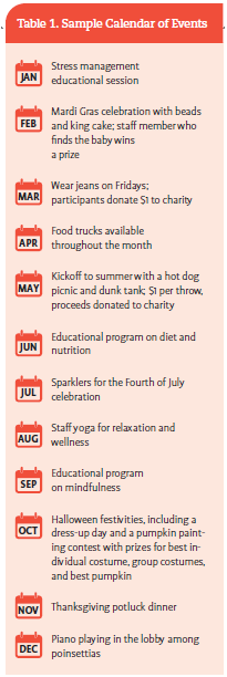 My team then built the program around these needs, integrating 1 structured event per month into our calendar (Table 1 is a sample calendar of our events). From Mardi Gras celebrations and food trucks to yoga sessions and mindfulness seminars, each activity was designed to relieve stress and strengthen our community. We also leveraged the incredible expertise within our own team—dietitians, nurses, social workers, and psychologists—to lead educational sessions on nutrition, stress management, and wellness activities.