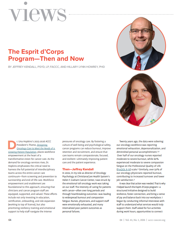 Over the years, we have seen firsthand how the Esprit d’Corps program has helped buffer the emotional toll of oncology work. From its early days addressing burnout and compassion fatigue to its continued relevance in today’s post–COVID-19 landscape, we have watched it evolve into a cornerstone of staff support. As Dr. Hopkins reminds us, designing oncology care to meet the needs of a growing patient population requires empowered, resilient teams. We believe that resilience-building programs like Esprit d’Corps must be embedded into the culture of cancer care—offering consistent, meaningful opportunities for connection, education, and emotional renewal. We should focus our future efforts on expanding evidence-based self-care models, incorporating holistic approaches, and improving access—and acceptance—of mental health resources. To truly support our colleagues, we must eliminate the stigma around mental health because seeking help should be seen as a strength, not a weakness. Let us commit to expanding access to mental health resources for our oncology teams, normalizing emotional support, and building a future where every member of the team feels seen, supported, and sustained.