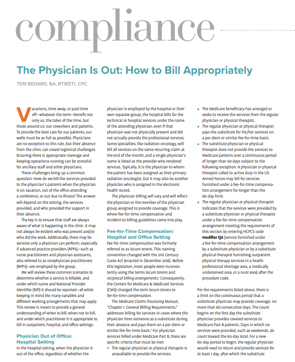 The key to incident-to billing is the physician’s direct supervision of the ancillary staff is required. This supervision includes all APPs/NPPs, nurses, radiation therapists, dosimetrists, and physicists. The Medicare Benefit Policy Manual, “Chapter 15: Covered Medical and Other Health Services,” addresses supervision in the office setting.3 Direct supervision in the office setting requires the physician to be present in the office suite. If a physician is out of the office on vacation, at a conference, or ill, any services provided cannot be billed under their name and NPI. Instead, another physician must be present and provide coverage via a fee-for-time compensation model, or another member of the group must cover and bill under their own name.