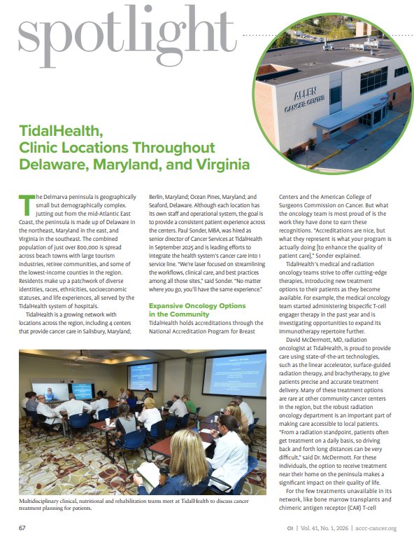 TidalHealth is a growing network with locations across the region, including 4 centers that provide cancer care in Salisbury, Maryland; Berlin, Maryland; Ocean Pines, Maryland; and Seaford, Delaware. Although each location has its own staff and operational system, the goal is to provide a consistent patient experience across the centers. Paul Sonder, MBA, was hired as senior director of Cancer Services at TidalHealth in September 2025 and is leading efforts to integrate the health system s cancer care into 1 service line. We re laser focused on streamlining the workflows, clinical care, and best practices among all those sites, said Sonder. No matter where you go, you ll have the same experience.