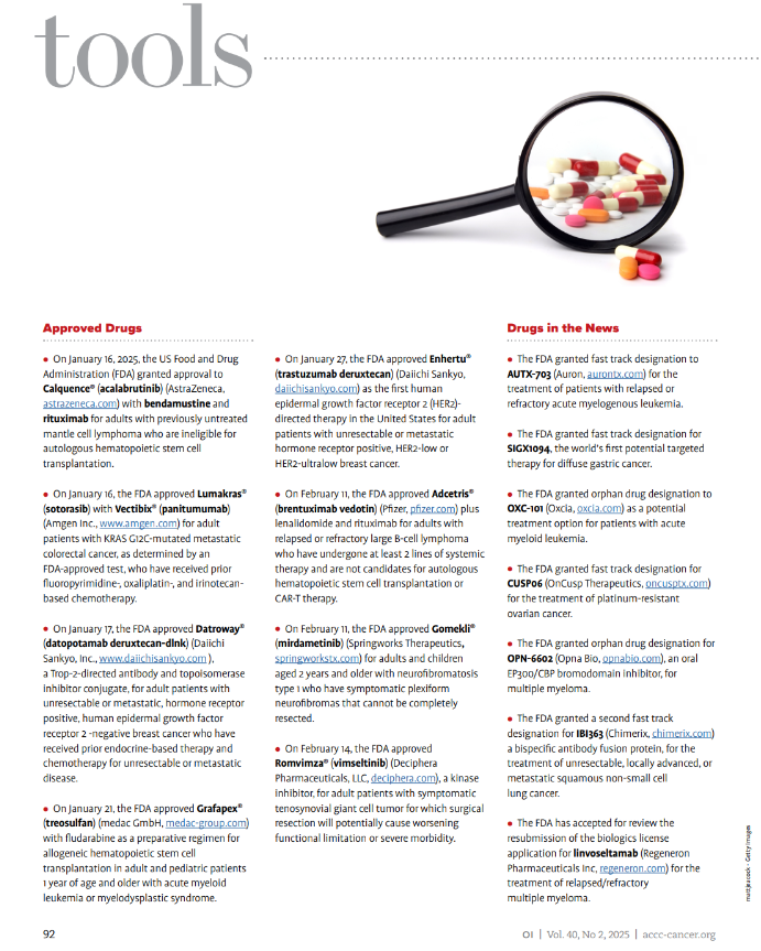 On January 16, the FDA approved Lumakras® (sotorasib) with Vectibix® (panitumumab) (Amgen Inc., www.amgen.com) for adult patients with KRAS G12C-mutated metastatic colorectal cancer, as determined by an FDA-approved test, who have received prior fluoropyrimidine-, oxaliplatin-, and irinotecan-based chemotherapy.
