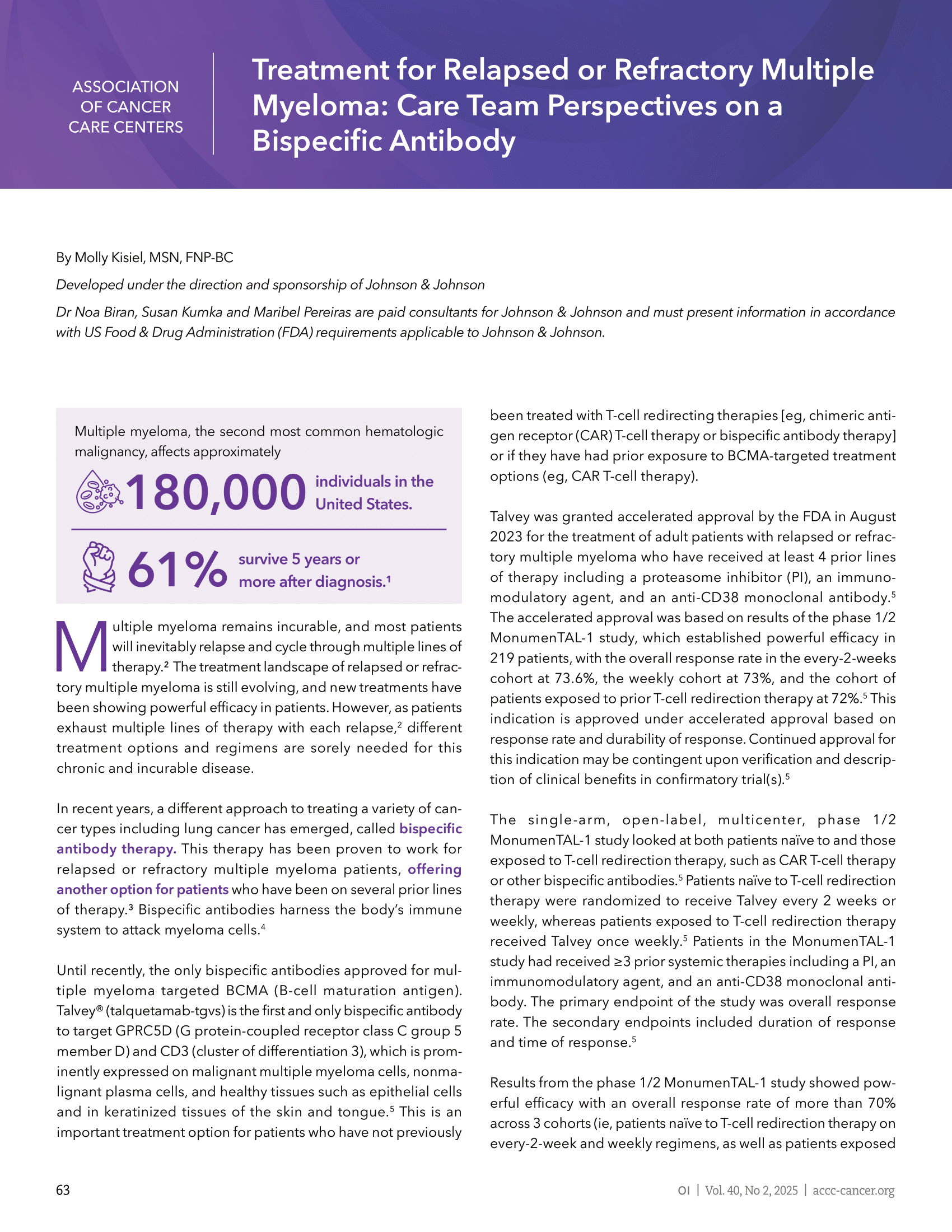 ACCC would like to extend gratitude to Dr Noa Biran, Susan Kumka, and Maribel Pereiras for their contributions to this article. Their expertise and dedication have been instrumental in advancing the understanding and implementation of Talvey for the treatment of relapsed or refractory multiple myeloma.