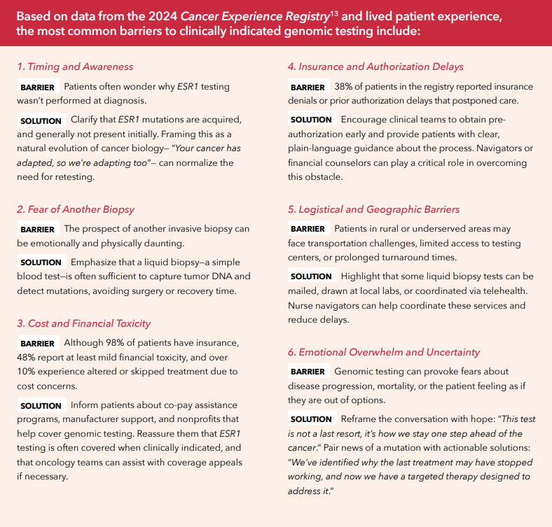 That plan begins with proactive communication. Oncologists, nurses, and navigators should introduce the concept of ESR1 testing early when endocrine therapy begins, normalize the idea of re-testing at progression, and provide clear, compassionate explanations. For many patients, knowledge is power—and testing represents hope.
